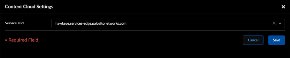 (Optional) Set the Cloud Content Fully Qualified Domain Name (FQDN) used by the Prisma Access to handle inline cloud analysis service requests. The default FQDN connects to hawkeye.services-edge.paloaltonetworks.com and then resolves to the closest cloud services server. You can override the automatic server selection by specifying a regional cloud content server that best meets your data residency and performance requirements.The Cloud Content FQDN is a globally used resource and affects how other services that rely on this connection sends traffic payloads.Verify that the firewall uses the correct Content Cloud FQDN (ManageConfigurationNGFW and Prisma AccessDeviceDevice SetupContent-IDContent Cloud Settings) for your region and change the FQDN as necessary: