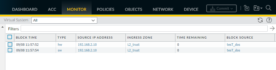 Delete block list entries.Delete an entry if you determine the IP address shouldn’t be blocked. Then revise the policy rule that caused the firewall to block the address.- Select MonitorBlock IP List.Select one or more entries and click Delete.(Optional) Select Clear All to remove all entries from the list.Disable or re-enable hardware IP address blocking for troubleshooting purposes.While hardware IP address blocking is disabled, the firewall still performs any software IP address blocking you have configured.
