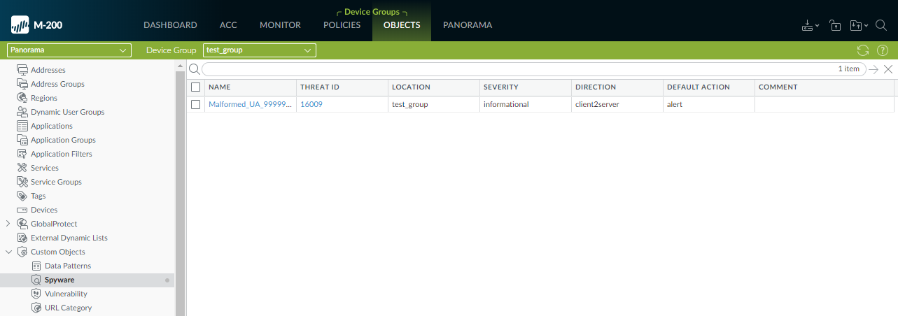 Import Custom Signatures.Select a Device Group from the drop-down.Select Shared to make the signatures available to all device groups.Under the Destination column, select whether to commit the signatures as Vulnerability or Spyware.Click OK.In the top right of the screen, selectand Commit to Panorama.