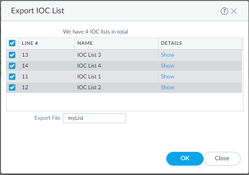 Click OK.Your signatures will populate at least one of the following tabs: Succeeded, Succeeded with Warnings, Failed, Duplicates, or Existing Coverage.(Optional) Export rules to an indicator of compromise (IOC) list.Panorama converts a rule that does not contain the keywords content or PCRE into an IOC List. Export IOC List to group these rules into a text file that you can use as an external dynamic list for your Security policy rules.- Select Export IOC List.A dialog displays any rules that converted as IOC List.