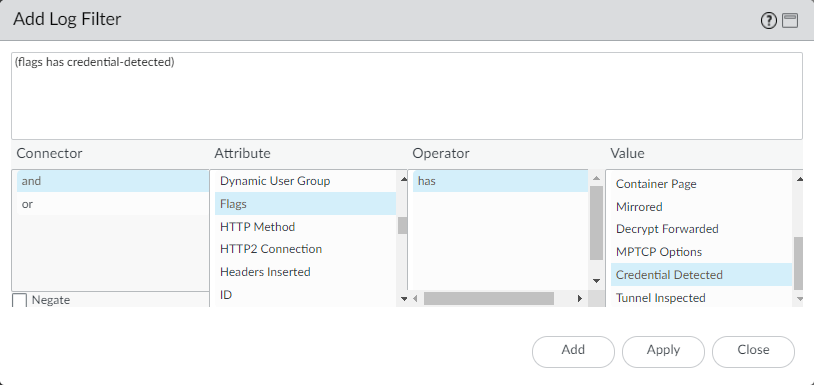 If the firewall is enabled to prevent credential phishing, select the Attribute Flags, the Operator has and the Value Credential Detected to also include events in the report that record when a user submitted a valid corporate credential to a site.