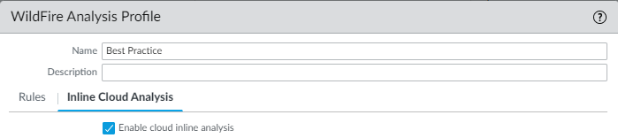 - Specify a rule defining an action to take when Advanced WildFire Inline Cloud Analysis detects advanced malware.![]()  - Name—Enter a descriptive Name for any rules you add to the profile (up to 31 characters).