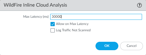 Configure the timeout latency and action to take when the request exceeds the max latency.![]()  - Specify the action to take when latency limits are reached for Advanced WildFire Inline Cloud Analysis requests:- Max Latency (ms)—Specify the maximum acceptable processing time, in seconds, for Advanced WildFire Inline Cloud Analysis to return a result.