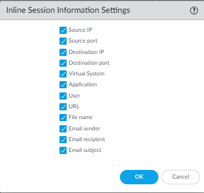 Specify the network session information that the firewall forwards about a given sample. Palo Alto Networks uses session information to learn more about the context of the suspicious network event, indicators of compromise related to the malware, affected hosts and clients, and applications used to deliver the malware. These options are enabled by default.![]()  - Select DeviceSetupWildFireInline Session Information Settings and select or clear the options as necessary.- Source IP—Forward the source IP address that sent the unknown file.
