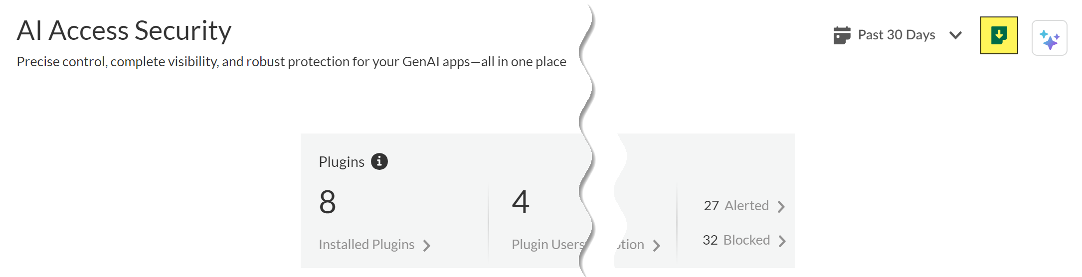 - Log in to Strata Cloud Manager.Select InsightsAI Access.Select the time frame for the AI Access Security Report.AI Access Security supports generating a report for the Past 24 Hours, Past 7 Days, or Past 30 Days.Download the AI Access Security Report to your local device in PDF format.The default file name is AI Access Security Report <generation-date>.pdf.Don't leave or refresh the page before the AI Access Security Report download completes. Leaving or refreshing the page before the download completes interrupts the download and you must download the AI Access Security Report again.