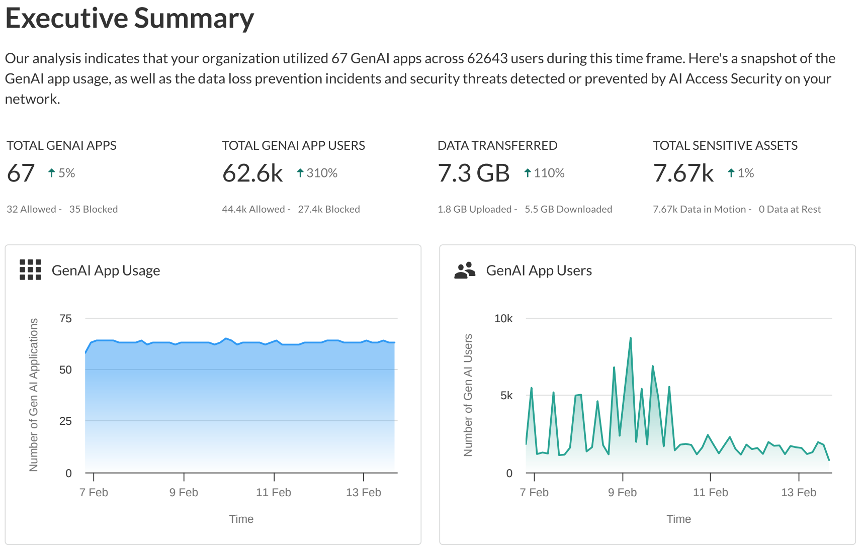 - GenAI app usage, giving you a quick understanding of how widely users in your organization access these apps.