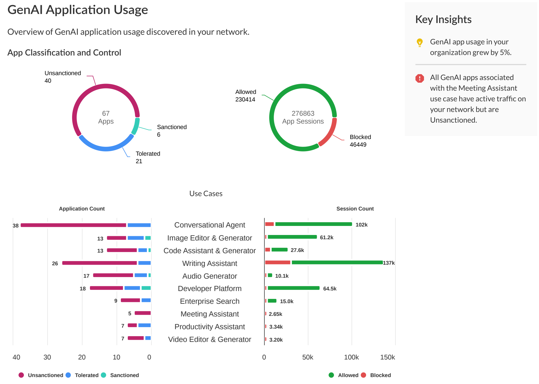 - Breakdown of GenAI use cases, categorized by the app classification (Sanctioned, Tolerated, or Unsanctioned) and whether traffic was Allowed or Blocked.