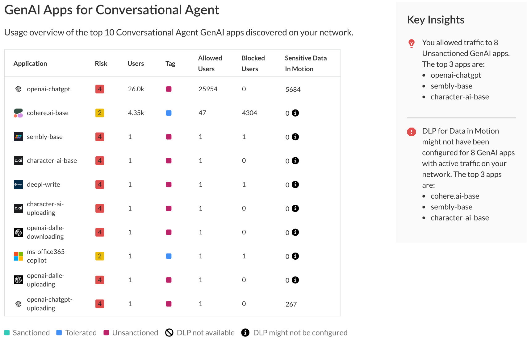 - GenAI app classification, indicating whether the app is Sanctioned, Tolerated, or Unsanctioned.