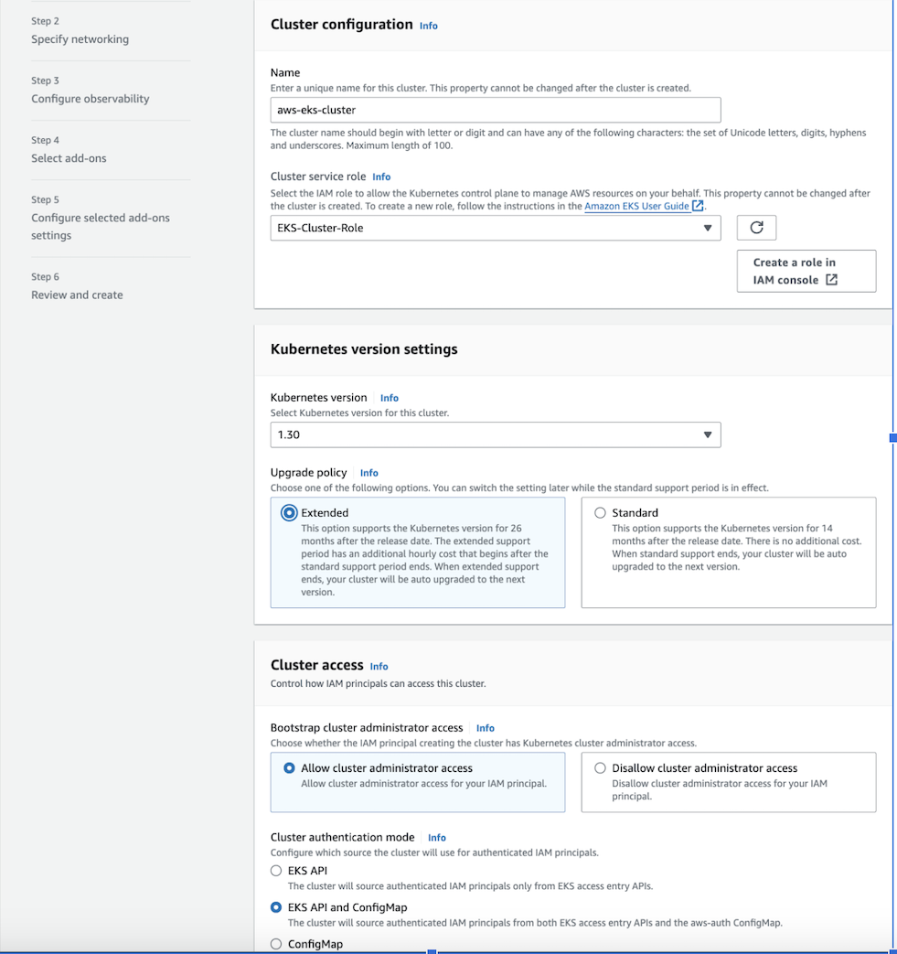 Allow the EKS clusters to authenticate users based on their IAM roles. Configure the following so the Prisma AIRS: Network intercept can discover the pod assets. Before you begin, create an Amazon EKS cluster in your cloud environment.- Sign in to the AWS Management Console.Go to Elastic Kubernetes Service.Navigate to the EKS Console.Click on your EKS cluster and select the Access tab within that cluster page.