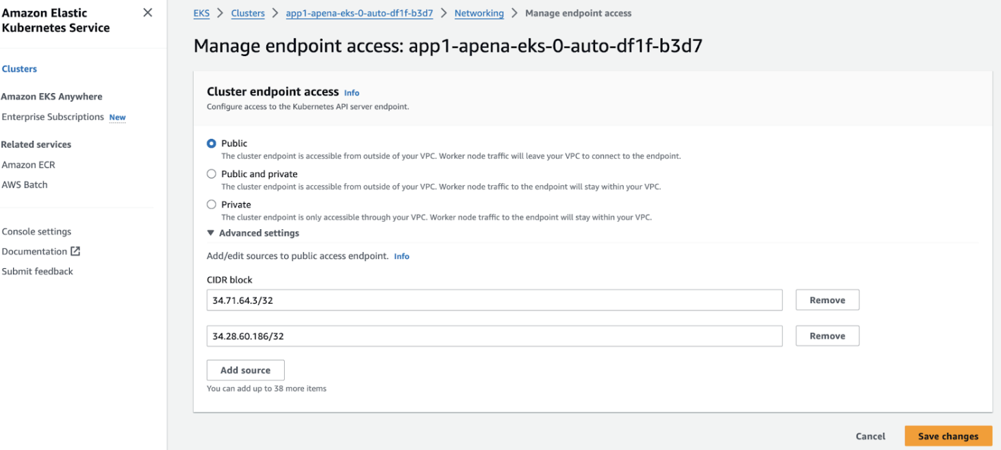 Save changes.Add the following IP addresses to allow the Strata Cloud Manager to access your public cluster for discovery (This step is applicable when you have enabled Public access to your cluster endpoint):- Navigate to your cluster and go to Networking > Manage endpoint access.