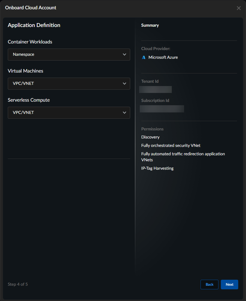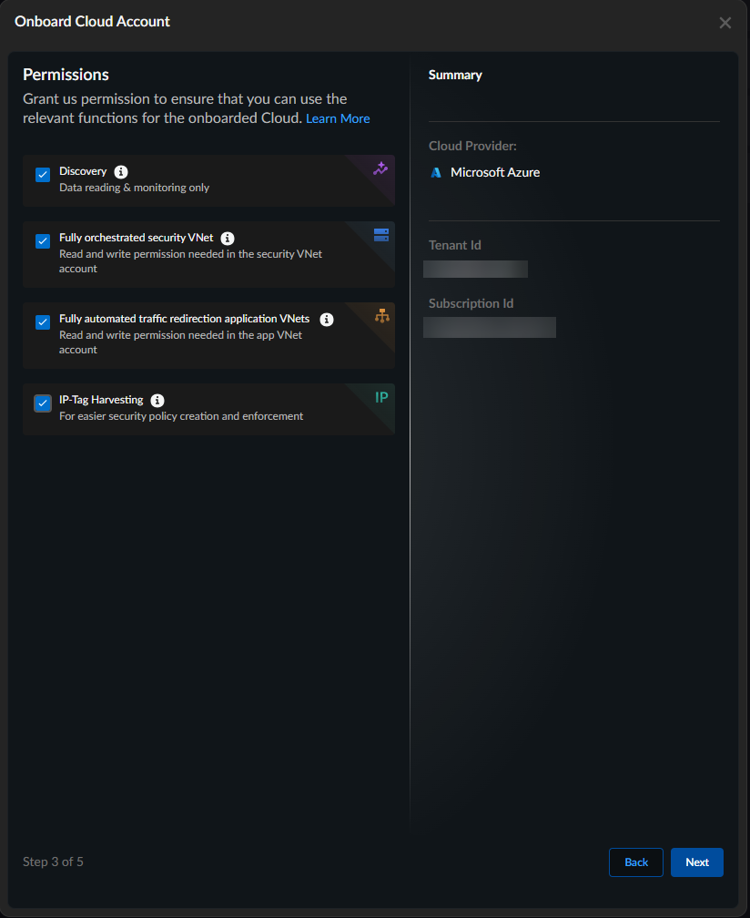 Click Next.Specify the permissions to apply to this AWS account. For a list of the specific permissions enabled, see Azure Required Permissions.- Discovery—this option is pre-selected and cannot be disabled. This allows Prisma AIRS to identify and monitor assets in your Azure environment.
