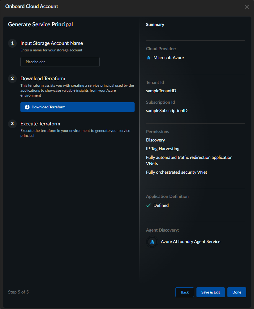 Download Terraform.Execute Terraform. Save and unzip the downloaded Terraform zip file.Navigate to the panw-discovery-<tsgid>-onboarding/azr folder and follow the `README.md` instructions to apply the Terraform in Azure to create the resources and add the role assignments.#Login to the Azure tenant from CLI and replace the "Tenant_Id" with your tenant_id value az login -t <Tenant_Id> #Replace the value with your subscription_id that is being onboarded az account set -s <Subscription_id> #Deploy the Terraform terraform init terraform plan terraform applyLog in to Azure Portal. Make sure you see the logs in Azure Storage Account → Data Storage → Containers → Insight flow logs and verify the date and hour.Select Done.This validates the successful creation of a service account in Azure.You can now view and manage the onboarded cloud accounts in Strata Cloud Manager.To discover your protected and unprotected cloud assets, see the page on discovering your cloud resources.Initial data should populate on Strata Cloud Manager in about 15 minutes and the flow logs may have a delay of about 3 hrs to show up on the Strata Cloud Manager dashboard.Next, protect the network traffic flow by deploying Prisma AIRS AI Runtime: Network intercept or VM-Series firewall in Azure.