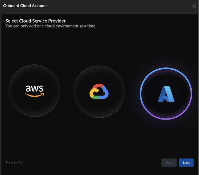 Select Add Cloud Account.Select Cloud Service Provider as Azure and select Next.