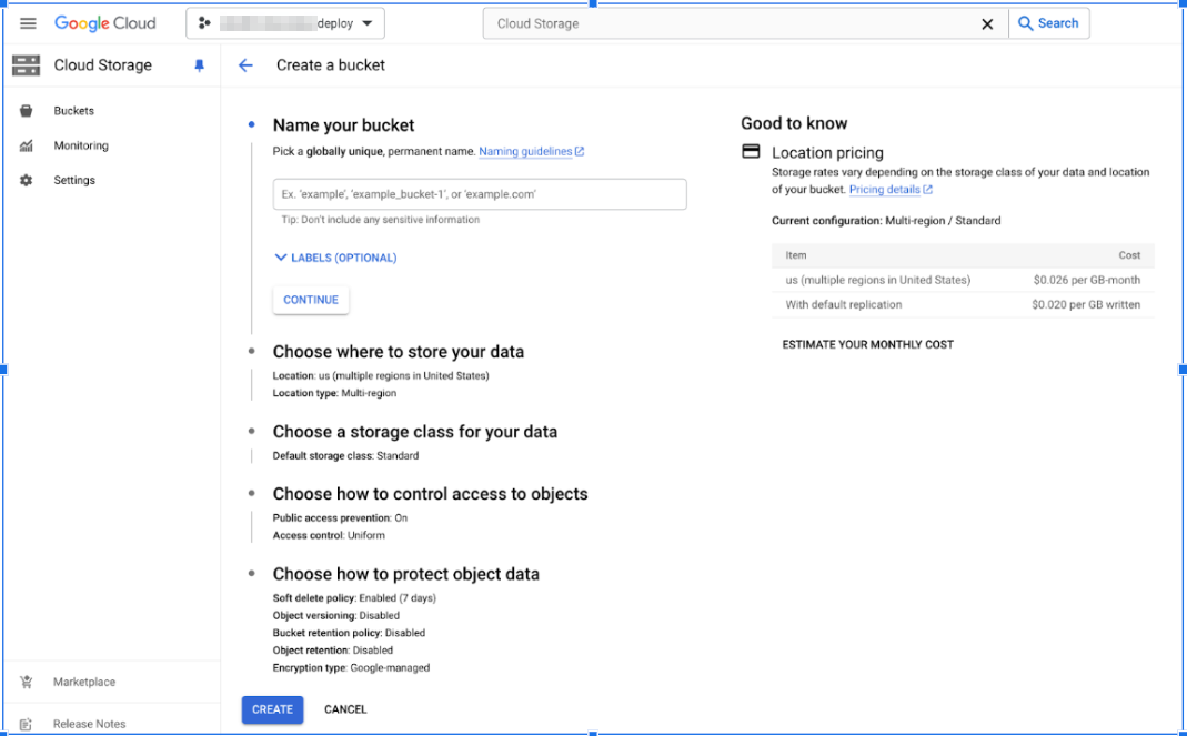 - Enter a globally unique name for the bucket and click CONTINUE.