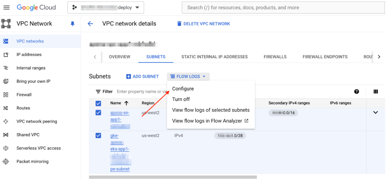 Strata Cloud Manager will discover only the running VM workloads and containers in the VPC.Click the SUBNETS tab and select all the subnets where your workloads are present.Click on the FLOW LOGS.Select Configure.