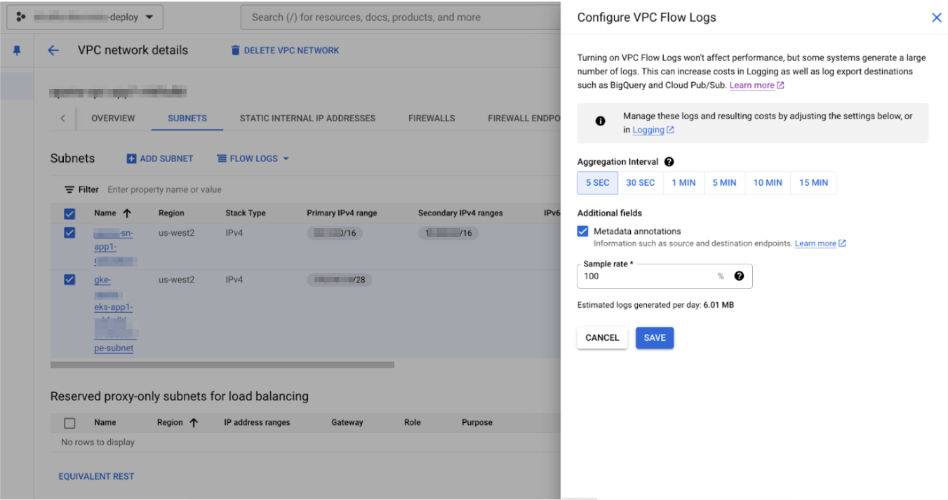 SAVE.To view the logs, click FLOW LOGS and select View flow logs of selected subnets.Enable Data Access Audit Logs