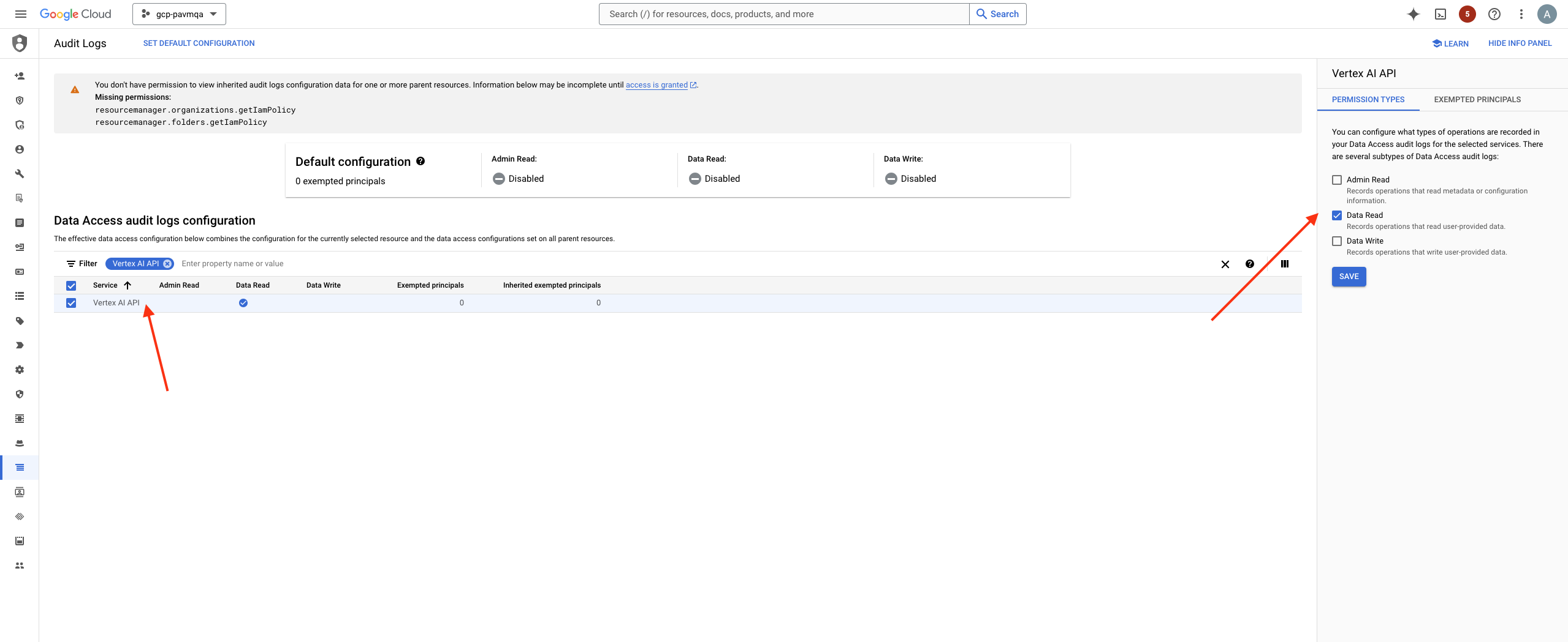 Before creating the Cloud Storage bucket, you must enable Data Access Audit Logs. In the IAM settings for the project where your AI models are deployed, ensure that logging is turned on specifically for unprotected AI model traffic. This step ensures visibility into how the AI models are being accessed, which is critical for audit and security monitoring. - Go to the Google Cloud Console and select your project.In the search bar at the top, type Audit Logs and select it.Search for and click Vertex AI API from the list of available audit logs.Enable the Data Read log under PERMISSION TYPE.SAVE.