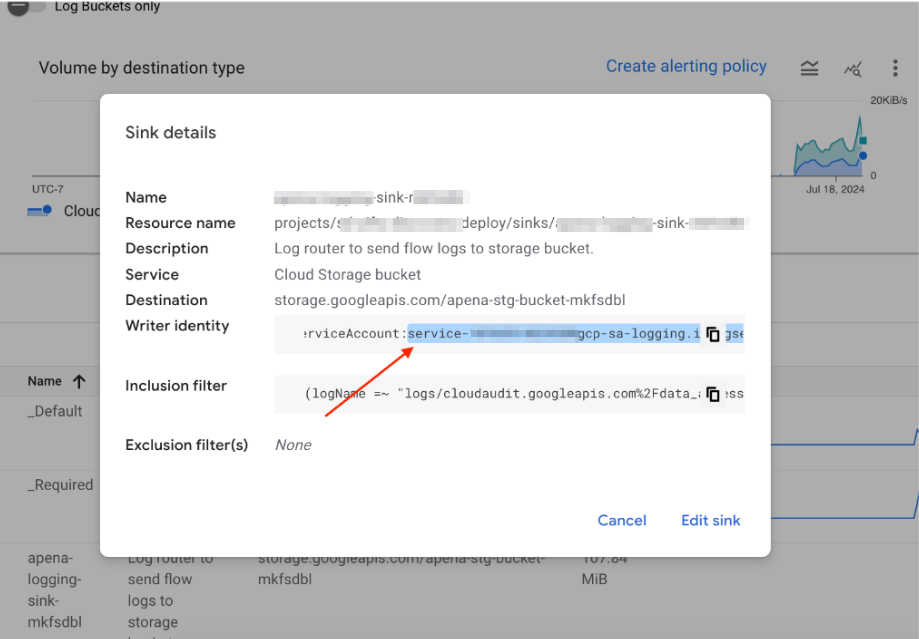 - In the Sink destination, choose Cloud Storage Bucket for the sink service.