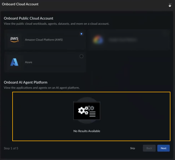 In addition, the Onboard AI Agent Platform section of the Onboard Cloud Account screen displays no SaaS agents: