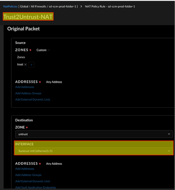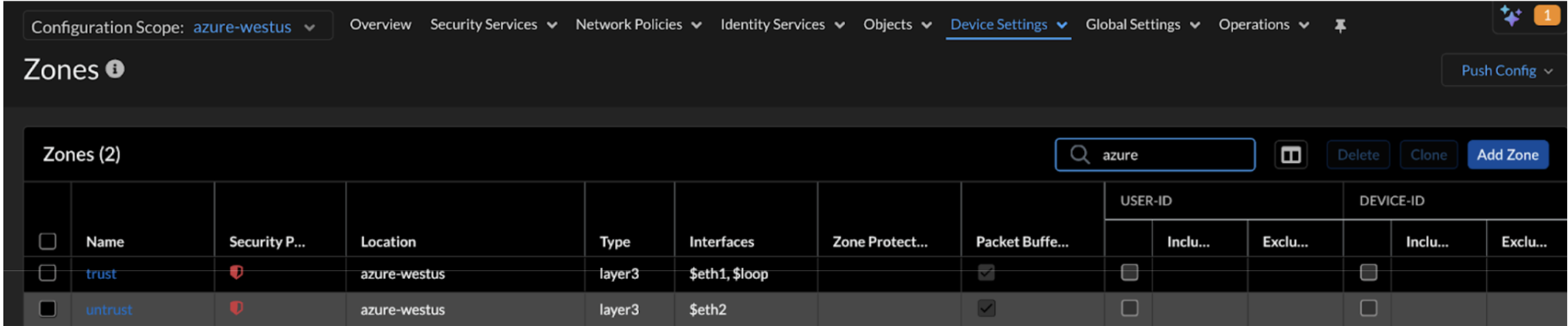 Select Add Zone.Enter a Name.Select Layer3 Interface type.In Interfaces, add $eth1 interface for the trust zone and $eth2 interface for the untrust zone.Save.NAT