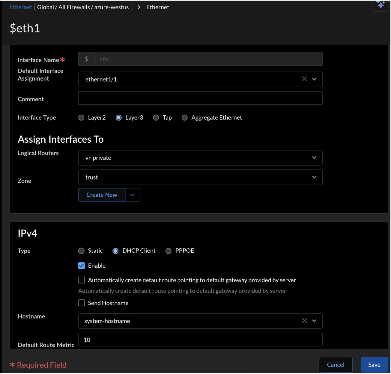 Configure private and public virtual routers: Azure health probe fails with a single virtual router (VR). Create multiple VRs to ensure probe success.- Navigate to Manage→ Configuration → NGFW and Prisma Access→ Device Settings → Routing.Enter a Name indicating private and public routers (for example, vr-private and vr-public).In Interfaces, select eth1(ethernet1/1) for the vr-private route and eth2(ethernet1/2)for the vr-public route.Refer to the above section on Interfaces to see how to configure the $eth1 and $eth2 interfaces.In Advanced Settings, select Edit to configure the IPV4 Static Routes for vr-private and vr-public.