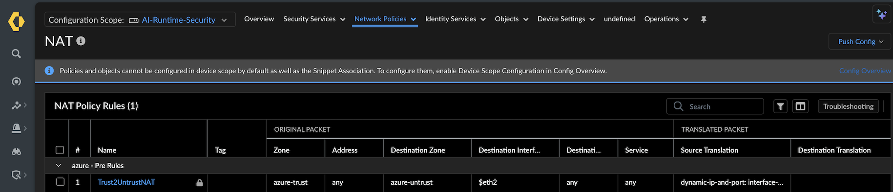 - Log in to Strata Cloud Manager.Configure routes for vNet endpoints as explained in the Routers section above to ensure a route to your application.Navigate to Configuration → Push Config and push the policy configurations to your Prisma AIRS AI Runtime: Network intercept.Create or update the NAT policy (refer to the NAT section above) to secure the VM workloads. Set the source address of the application you want to secure.