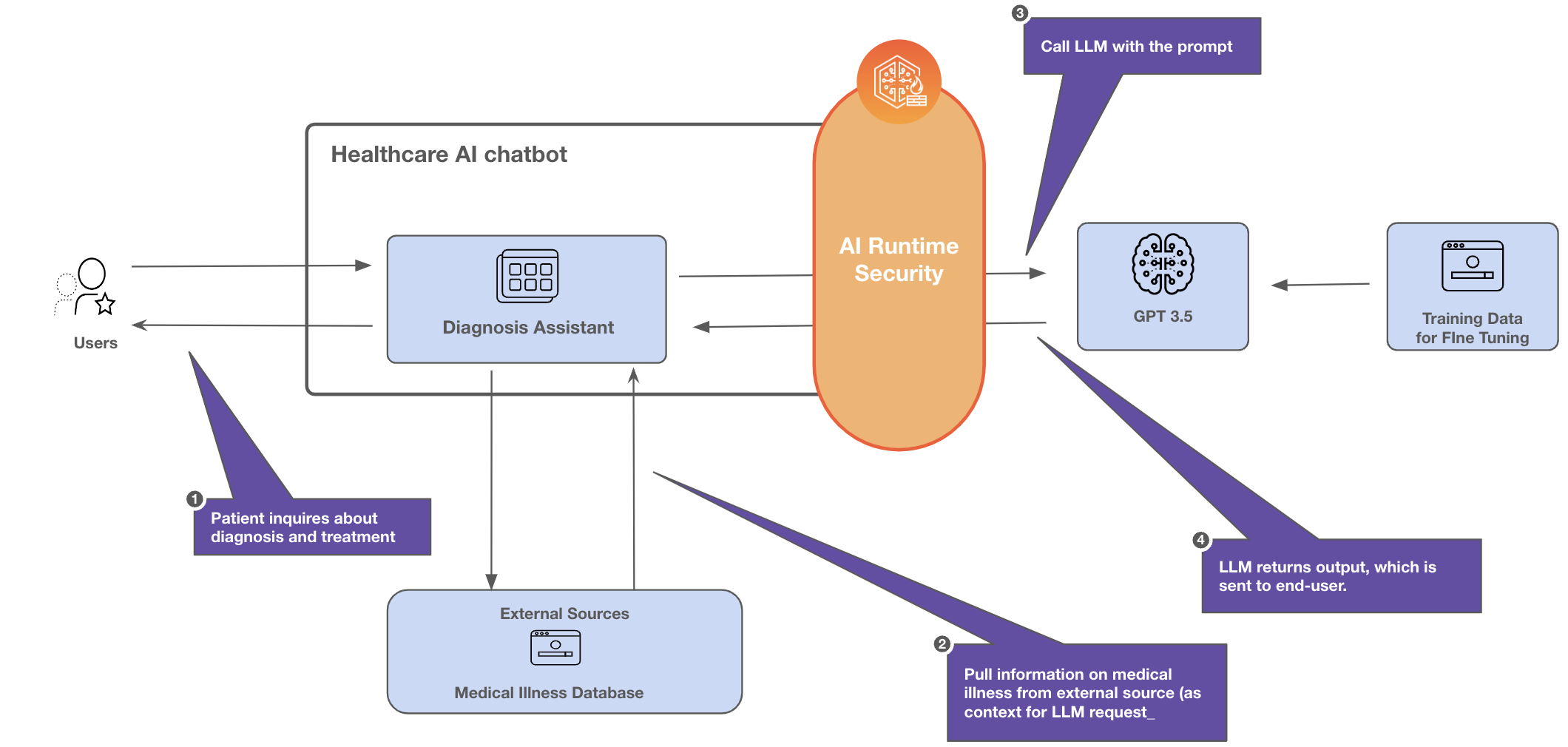 model. As the user app interacts with the AI Medical Assistant, the Prisma AIRS: Network intercept monitors the traffic