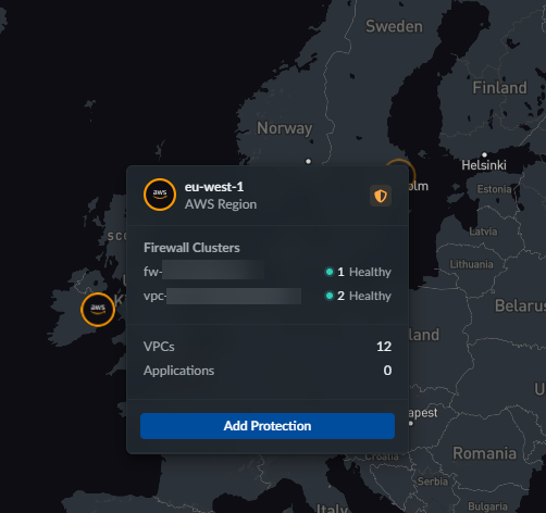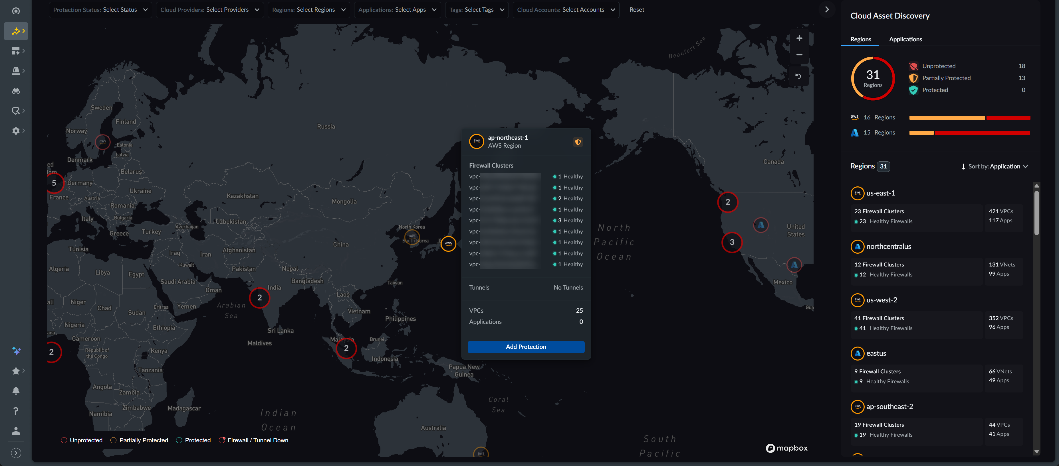 specific regions to view detailed information about VPCs, applications, firewalls, and
