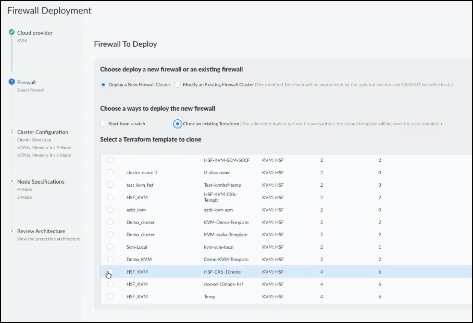 - Log in to SCM and navigate to Insights > Deployment.Select Private Cloud KVM and select Modify an Existing Firewall Cluster.Select the HSF cluster you wish to modify and click Next.Modify the parameters you wish to change such as Number of vCPUs, memory, image path and so on.Click Create Terraform Template and then Download Terraform template.The parameters that are greyed out are not modifiable. You may choose to Clone an existing Terraform as a template.