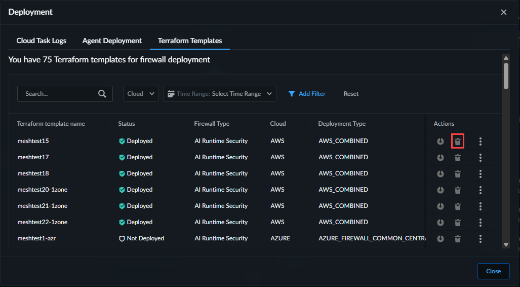 Click the Terraform Templates tab.Select the deleteicon to decommission the Terraform template and cloud resources deployed by Prisma AIRS.