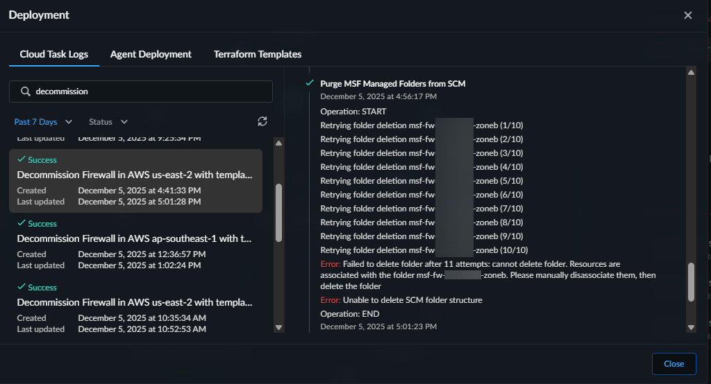 The decommission might succeed but some errors might be logged. In the following example, the decommission succeeded but the Cloud Task log displayed errors in the Purge MSF Managed Folders from SCM.The Purge MSF Managed Folders from SCM activity within the Decommission task may currently log an error if other active firewall clusters exist in the same folder, but this error has no functional impact on the system.