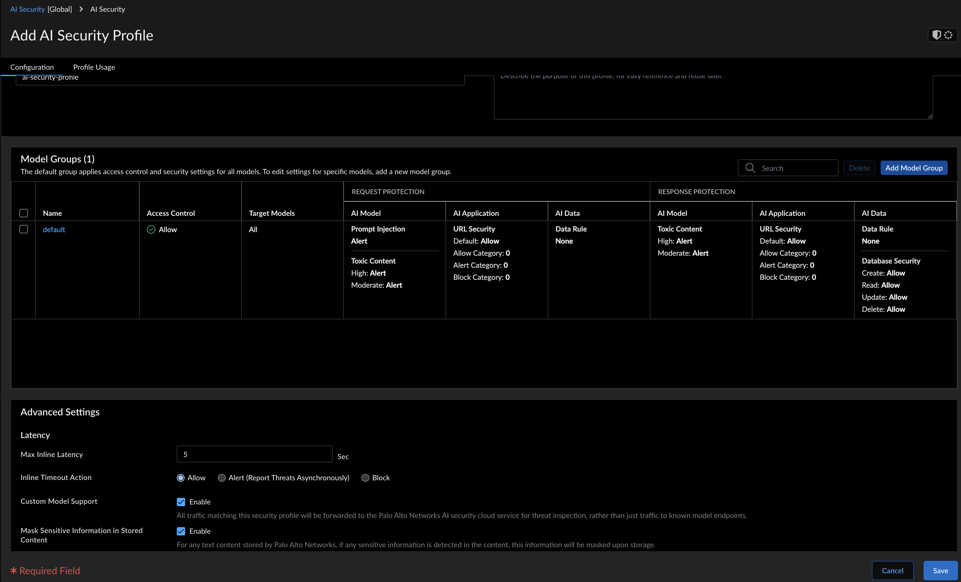 - Custom Model Support: When enabled, all traffic matching this security profile will be forwarded to the Palo Alto Networks AI security cloud service for threat inspection, rather than just traffic to known model endpoints.