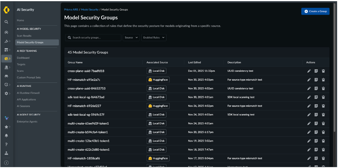 Learn how to create, modify, and delete model security groups in Prisma AIRS AI Model