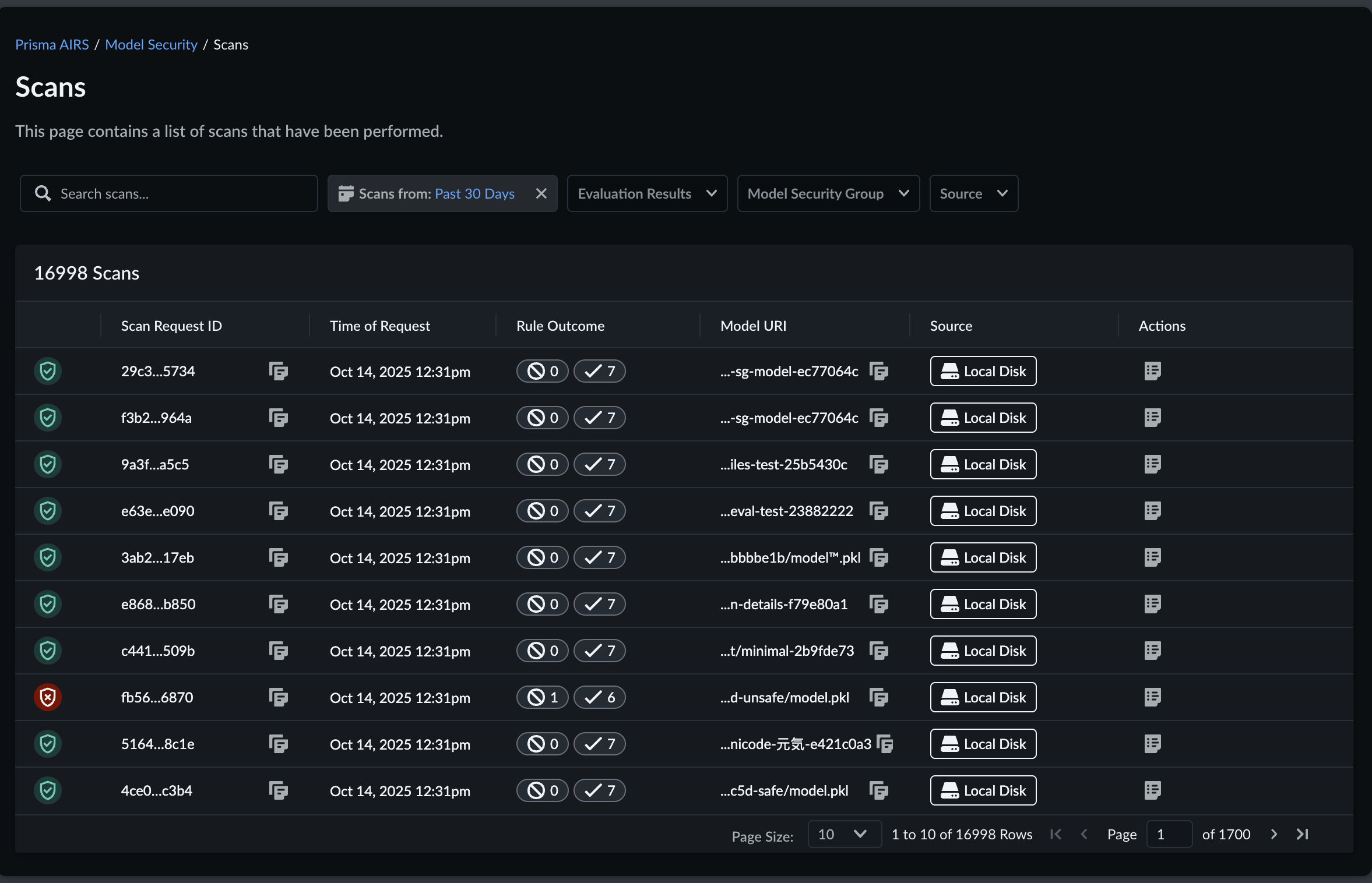 from datetime import datetime, timezone from airs_schemas.constants import SourceType, EvalOutcome scans = client.list_scans( source_types=[SourceType.HUGGING_FACE, SourceType.S3], eval_outcomes=[EvalOutcome.ALLOWED, EvalOutcome.BLOCKED], start_time=datetime(2025, 1, 1, tzinfo=timezone.utc), limit=50 )