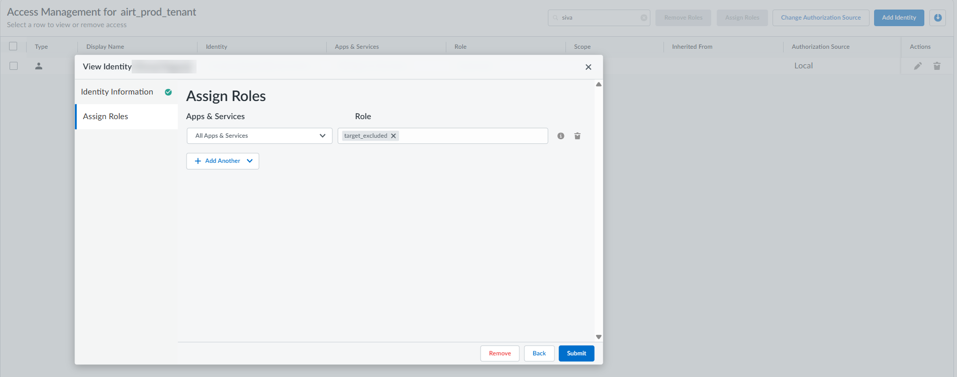 2. Navigate to Identity & AccessAccess Management and select the tenant from the tenants list. Verify the Identity Information for the selected tenant to ensure that the Role assigned is either Superuser for all apps and services, or a Read only role with access to AI Red Teaming.