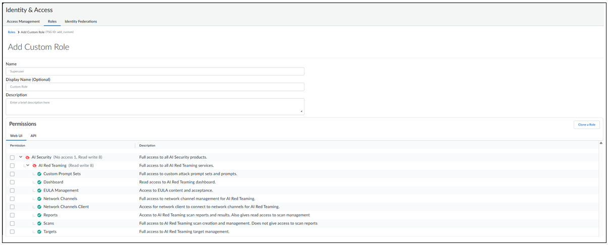 Configure IAM roles and permissions for Prisma AIRS AI Red Teaming, including custom roles creation and API access setup with minimum required permissions for SDK usage.
