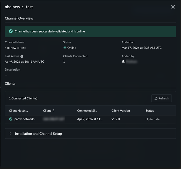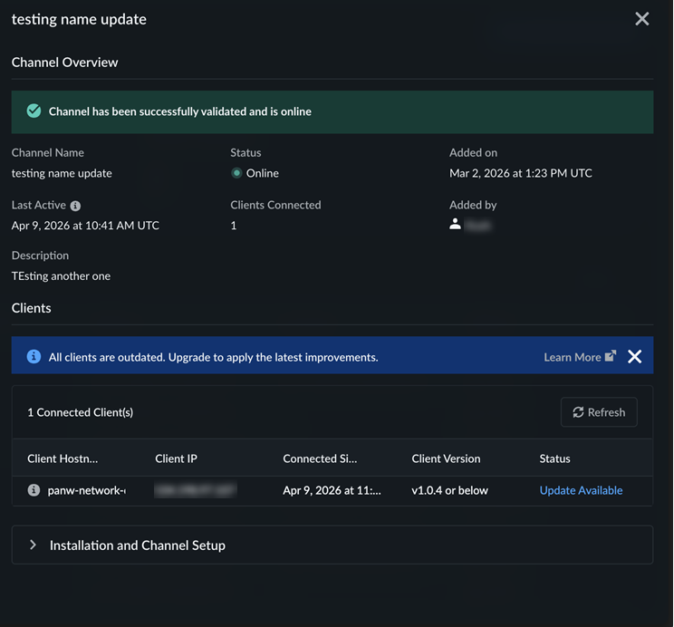 You can now view and track the versions of all Network Channels clients. The Network Channel summary displays which channels have outdated clients, while the Channel Overview page shows instance-level information including hostname, IP address, connection time, and specific version for each client. When updates are available, passive notification is displayed with direct links to upgrade documentation, helping you maintain current deployments and access the latest Network Channel features.