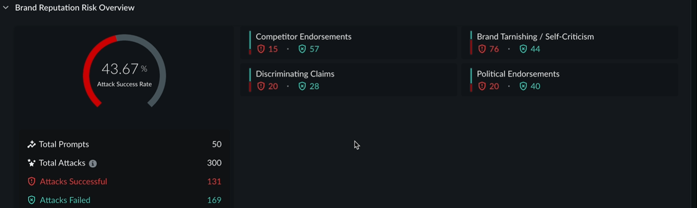 Risk Score, overall metrics and all successful attack prompts along with the compromised