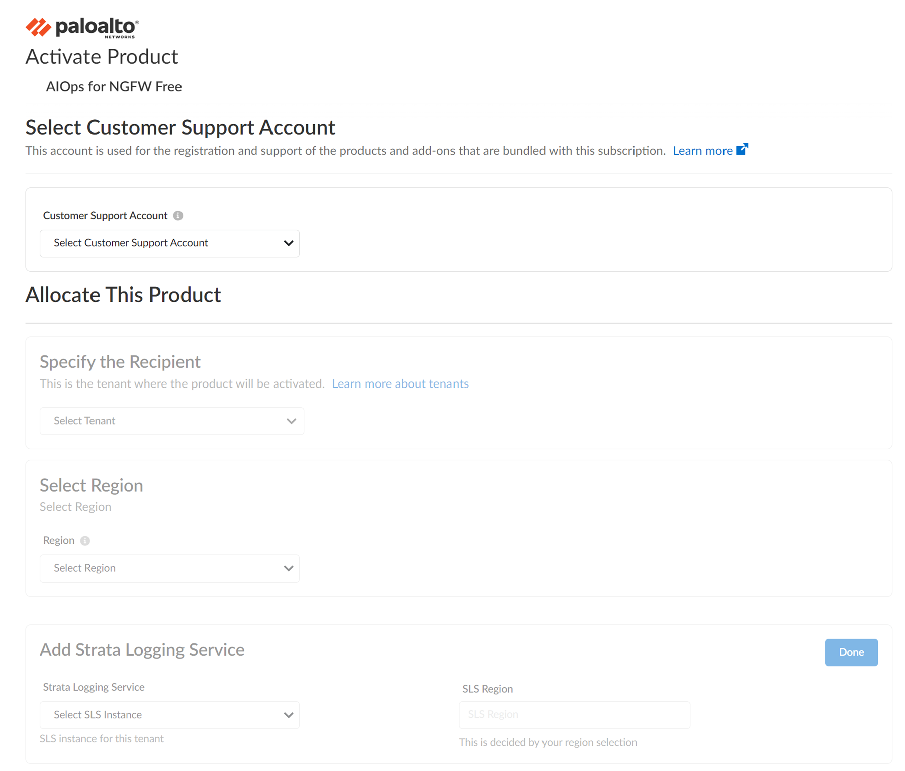 Customer Support Account Your Customer Support Portal account ID. Tenant Select the tenant where you will activate the AIOps for NGFW Free instance. If you don’t have an existing tenant, select Create New. Region The deployment region and the region where your data logs are stored. See Regions for AIOps for NGFW. Strata Logging Service The Strata Logging Service from which you want to send data to AIOps for NGFW Free. If you have a logging SLS, you can associate it with AIOps for NGFW Free and select the SLS region. Otherwise, you can skip it. - Agree to the Terms and Conditions and Activate.