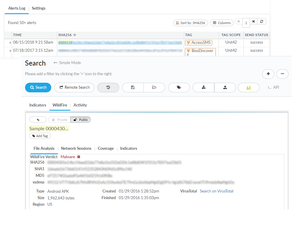 - Search on the latest sample that triggered an alert.Click the sample hash on the Alerts Log widget to perform an AutoFocus search:
