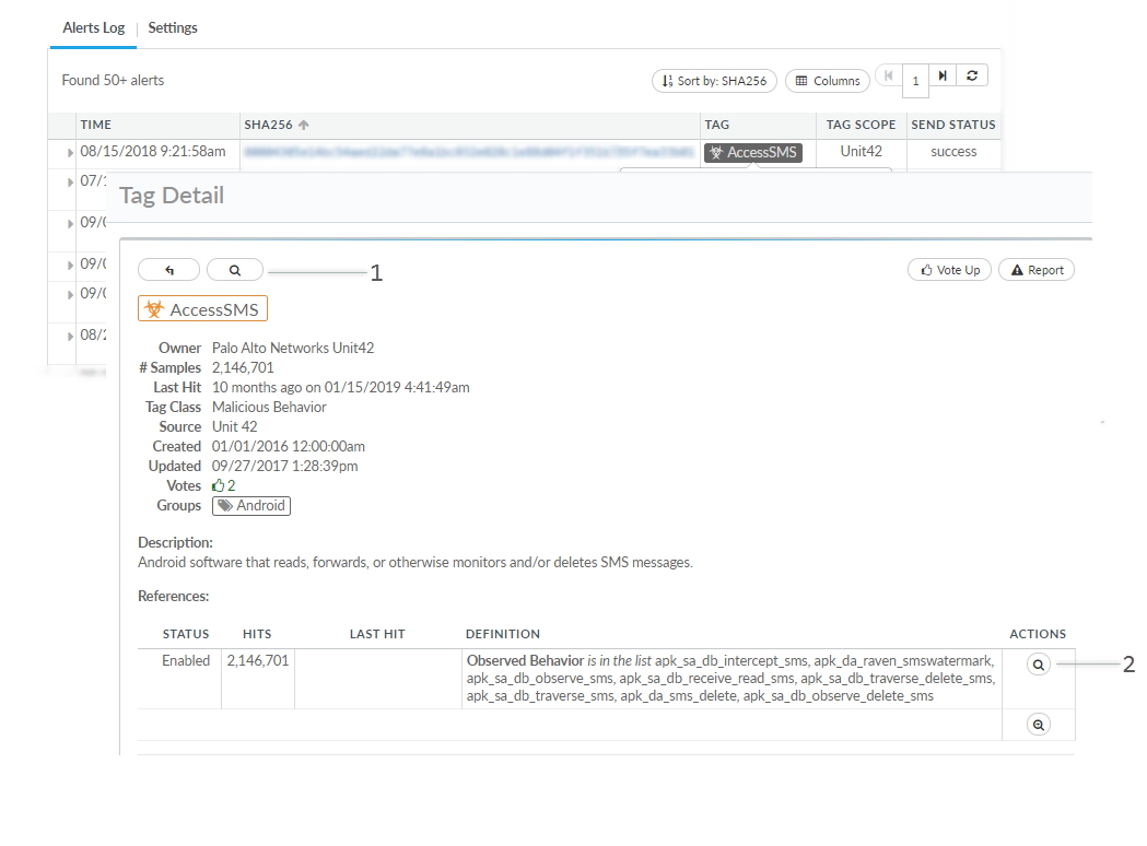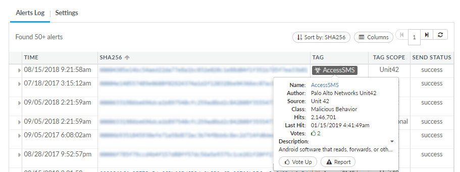 - Select AlertsAlerts Log to view all samples that have triggered alerts. Sort the rows according to Time, Tag Type, SHA256, or Tag. Alternatively, click the column headers to sort the rows in ascending (up arrow) or descending (down arrow) order.You can also click the SHA256 link for a sample entry to add the sample to a search: