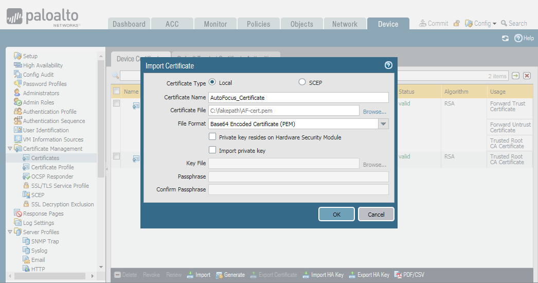 - On the firewall, select DeviceCertificate ManagementCertificates.