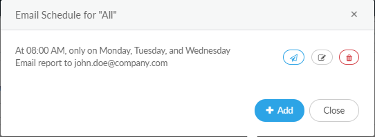 The number of email schedules that are configured for a given report is shown in the Email Scheduler button. - Add an email schedule profile.