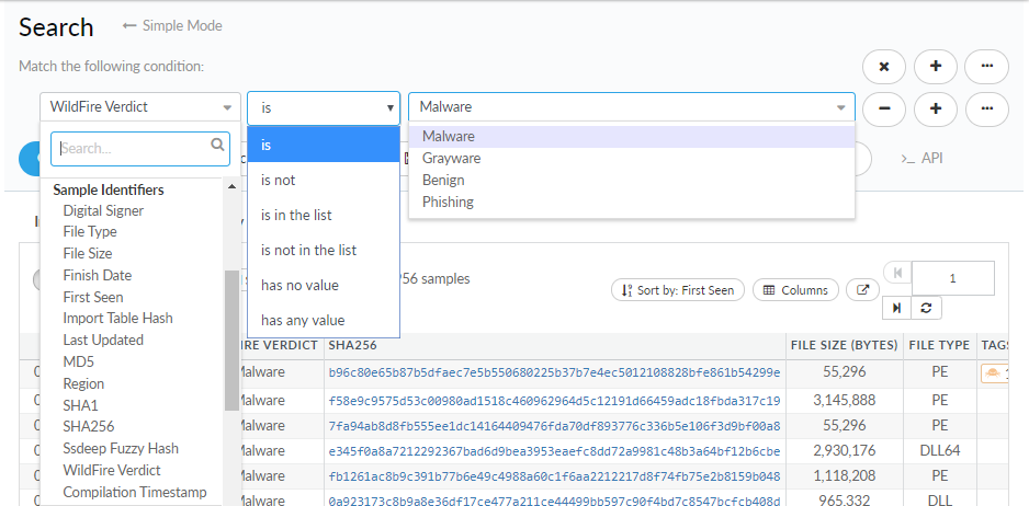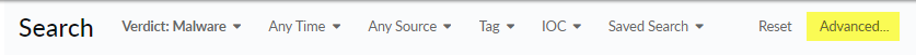 - Search by Verdict—Select from Malware, Grayware, Benign, Phishing, and Any Verdict to search the data set based on a verdict.
