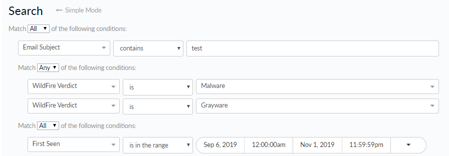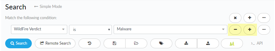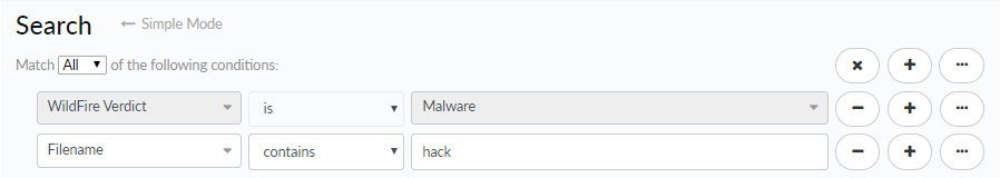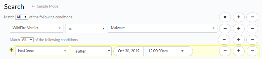 Click Add Parent Query to nest a search condition under the preceding condition. AutoFocus then only evaluates the nested search condition against the parent condition.In the example below, click Add Parent Query to nest the First Seen condition under the WildFire Verdict condition. Search results will be returned for samples where any of the following conditions is true:- The sample received a WildFire verdict of malware and was first seen before July 1, 2016.