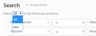 Create a simple mode search by selecting the relevant conditions from the drop-down menus. Should you need to run a search using other variables, you must define the scope and value in the Advanced search:- Configure your search by selecting the desired