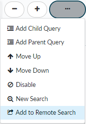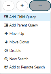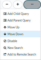 Move Up or Move Down search conditions to move conditions to or from a child query. Depending on the placement of a condition, you can move it up or down to include it in a child query. You can also move a condition up or down to remove it from a child query so that it is no longer a nested condition.Alternatively, you can move a search condition using the keyboard. Placing the cursor over the left edge of a condition displays a directional icon. Click on the icon next to the condition or condition group you want to move and then use the keyboard arrows to change the placement. Depending on the location of the condition, you can also create child and parent queries by pressing the right arrow key. Exit the keyboard movement mode by pressing the escape key or by clicking the selected condition.