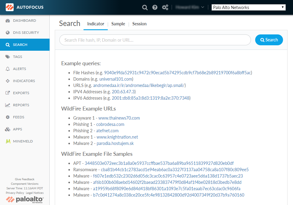 and file hashes. When switching the search context from Indicators to WildFire or Activity, AutoFocus reapplies the search term using a valid artifact type into an advanced search mode. This allows you to quickly pivot for more information about a particular indicator.