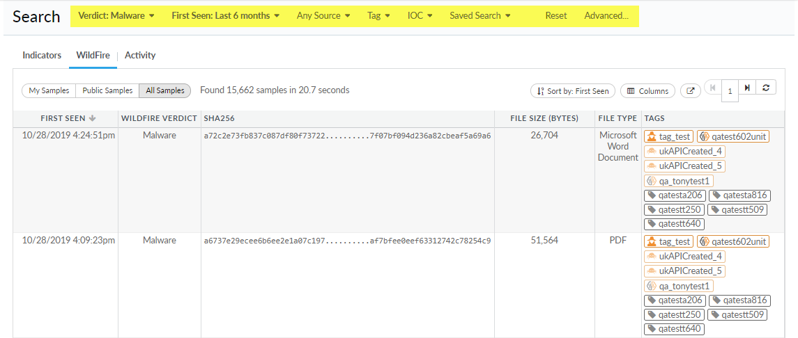 - Sample—Search based on samples sent to WildFire for analysis by various connected appliances and services. WildFire receives samples from the following sources: Firewalls, WildFire, Traps, Traps Android, Magnifier, Proofpoint, Prima SaaS, manual uploads, partner integrations, and other industry sources.