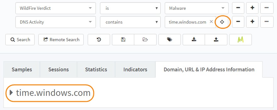 - Click the target icon or expand the search result listed under the Domain, URL & IP Address Information tab.![]()